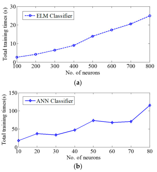 Total training times obtained from both classifiers: (a) ELM; (b) MLP.