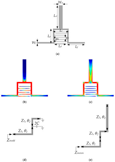 Due to the symmetry of the structure, the behavior of the resonator can be analyzed using even/odd-mode analysis. The current distributions of the two fundamental modes are shown in Figure 1b,c and they reveal that the first resonance is the fundamental odd mode resonance, whereas the second one is the fundamental even resonance. Equivalent odd- and even-circuits are shown in Figure 1d,e, where θ1, θ2, and θ3 represent the electrical lengths of the corresponding segments; Z1, Z2, and Z3 their characteristic impedances; whilst the parameter C represents the capacitance between the two segments of the length Lp. One should note that Z1 is equal to Z2 due to the same microstrip line width. Also, Z3 is the characteristic impedance of the microstrip line whose width is half of that of the stub shown in Figure 1a. Counterintuitively Z3 is not equal to half of the characteristic impedance of the stub since microstrip characteristic impedance does not depend linearly on the line width.