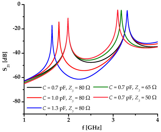 Response of the circuit model of the proposed resonator for different values of the capacitance of interdigital capacitor C and characteristic impedance of the microstrip line whose width is half of the stub Z3.