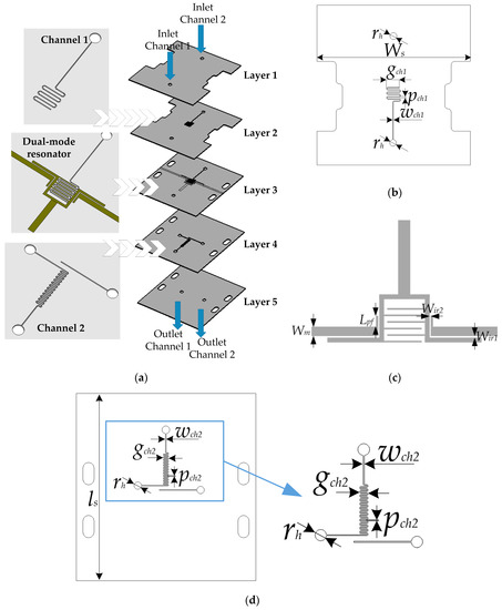 Channel 1 is realized in three layers—2, 3, and 4—so it can be meandered in the area between the interdigital lines, and at the same time it does not intersect the conductive lines of the resonator nor does it have a contact with the interdigital lines. The microfluidic inlet and the meandered channel are made in layers 2 and 3, after which the fluid is transferred to layer 4 in which the channel outlet is realized. On the other hand, channel 2 is realized only in layer 4, since it is located below the stub and therefore does not need to span over several layers. Layers 1 and 5 serve as cover layers for the microfluidic channels and overall structure. Also, the small holes are used as inlet and outlets for the sensor, whilst the cuts in layers 1 and 2 and outermost holes in layers 3, 4, and 5 are made to allow the connectors to be assembled.