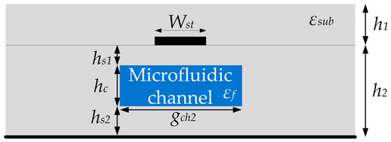 As for the second resonant mode, it was shown that it can be independently controlled by the electrical length and characteristic impedance of the stub, which depend on effective permittivity of the stub. Unlike the interdigital lines, the stub represents a conventional microstrip section whose effective dielectric constant can be most effectively varied by positioning the microfluidic line either above or below the stub. Since these two positions have practically the same effect on the stub, the channel is chosen to be positioned below the stub and thus the effective permittivity can be calculated if the structure in Figure 4 is considered. The top surrounding medium is made of LTCC dielectric substrate with the permittivity εsub, whilst the bottom surrounding medium is made of the same material in which a microfluidic channel is embedded, having a dielectric constant that corresponds to the sensed fluid.