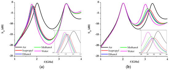 The simulation results of the proposed sensor with different fluids placed in channel 1 and channel 2 when the other one is filled with air, are shown in Figure 5a,b, respectively. Each fluid in the simulation is modelled with its material parameters, i.e., its permittivity and dissipation factor, as shown in Table 1 [44].