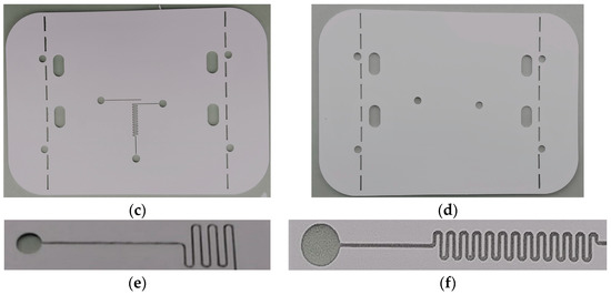 Green tapes after the cutting process: (a) Layer 1; (b) Layer 2; (c) Layer 4; (d) Layer 5; (e) Enlarged detail of layer 2; (f) Enlarged detail of layer 4.