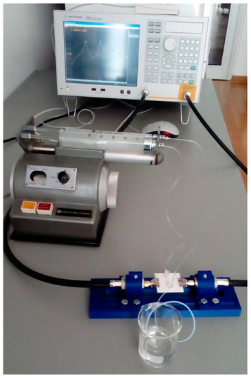The measurement setup is shown in Figure 9, in which the fluids were injected through the additional tubules into the microfluidic channel using a syringe pump. To measure the responses for various fluids in each channel, the fluids were injected in one channel whilst the other one was kept empty, i.e., filled with air. The characteristic parameters of the fabricated sensor were measured in the frequency range between 1 and 4 GHz using a two-port Agilent 8501C Vector Network Analyser.
