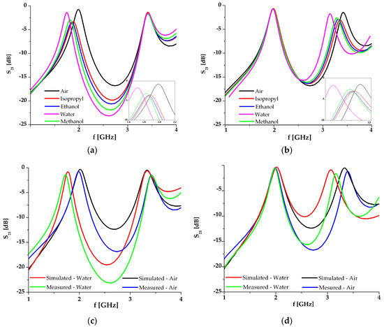 The measurement results for different fluids in channels 1 and 2 are given in Figure 10a,b, respectively. The simulation and the measurement results are compared in Figure 10c,d. For better visibility, the measurements and simulations are compared only for the two fluids with the lowest and highest dielectric constant, i.e., air and water. It can be seen that the simulated and measured results are in good agreement, except for a small frequency shift which can be attributed to the fabrication tolerances. The measured results exhibit somewhat higher losses, which are however less than 4.4 dB, i.e., they are sufficiently good for this type of circuit.