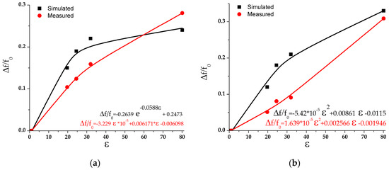 Frequency change (Δf/f0) versus the change of fluid permittivity for: (a) Channel 1; (b) Channel 2.