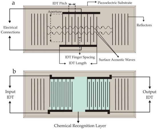 SAW devices are made of piezoelectric materials on which a periodic comb-shaped interdigital transducer (IDT) pattern is developed by a photolithographic or other process. These electrodes are generally made of inert metals or alloys, for example Au, Cr/Au/Cr, etc. When an AC voltage is applied to these IDTs, an acoustic wave is generated which travels across the crystal surface, however, perpendicular to the IDTs but in an away direction. The velocity of surface waves is 10−5 times that of light waves. These acoustic waves are confined to the substrate surface, having penetration depths of a few wavelengths which indicates that they possess high surface energy. Lord Raleigh was the first to explain the propagation of waves along the plane surface of elastic solids in his classical paper [31]. A typical SAW resonator is shown in Figure 1a. In this configuration there are specially designed grating reflectors having a period of λ/2 which are used to reflect back the surface waves towards the IDTs for resonance. A single port SAW device contains only one set of IDTs, but two reflectors on each side of the crystal for obtaining suitable resonance signals. Single port SAWs are usually considered for making oscillating circuits whereas two port devices are useful for developing special frequency filters.