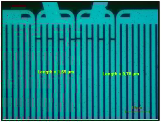 Optical microscope image of two port SAW device showing the IDT electrode width, i.e., 1.69 μm and spacing, i.e., 0.76 μm between two consecutive fingers.