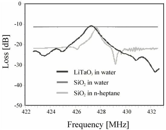 Damping spectra of LiTaO3 and SiO2 in water. Damping of SiO2 in n-heptane is also shown. It is seen here that SiO2 has no resonance spectrum in water due to its high dielectric constant (≈80). However, SiO2 shows some damping spectra in n-heptane that has dielectric constant of about 1.9. LiTaO3 exhibits suitable resonance in water, demonstrating its ability to work in aqueous phases. Adapted with permission from [45], copyright (2010) Elsevier.