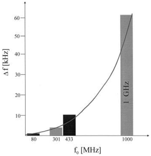 Sensor responses of different SAW devices for 1000 ppm of toluene. All the devices are coated with the same recogntion layer i.e., permethylated β-cyclodextrin linked with hexafluorobenzene having a layer height of 60 nm, and the basic frequencies of the devices were 80, 301, 433 and 1000 MHz. Adapted with permission from [47], copyright (1998) Elsevier.