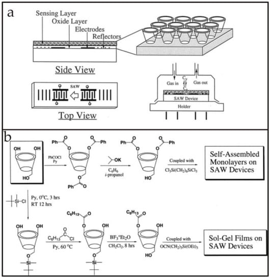 For instance, the hydrophilic character of β-cyclodextrins (7-membered rings) can be modified by derivatizing the OH groups with alkyl ethers which improves the hydrophobic recognition properties for different analytes and also helps to avoid interferences caused by humidity. Furthermore, cyclodextrins linked with hexafluorobenzene [57] were also used to improve the recognition properties for aromatic analytes and also increase the number of binding sites. Such sensor coatings are highly selective in distinguishing benzene from cyclohexane, for example. This suggests that careful substitution of cyclodextrin terminal groups is important in controlling the hydrophobicity and also shaping the cavities for geometrical fitting of target analytes. Thus, in this way the selectivity offered by host structures is tuned for a range of guest molecules. Li et al. [58] reported cyclodextrin-based self-assembled monolayers and sol-gel-derived multilayers combined with 200 MHz SAWs for organic vapor sensing. The authors proposed that cyclodextrin-monolayers are suitable for studying specific molecular interactions between layer and analyte vapors whereas cyclodextrin sol-gel thick layers are much easier to synthesize with improved responsive character. Figure 5a shows a schematic representation of cyclodextrin derived layers coated on a SAW device for gas sensing. Furthermore, the synthesis schemes of self-assembled monolayers and sol-gel films are also shown in Figure 5b. The relative sensitivity and selectivity of cyclodextrin-derived mono- and multi-layers was compared, which revealed that going from mono- to multi-layer, the relative selectivity remains unchanged, however, the sensitivity increased by a factor of 140. Nonetheless, the thickness of the sensor layer is also important in reducing the noise level during sensor measurement since in another study [59] it was observed that cyclodextrin monolayers result in a homogeneous coating which showed noise of only 4 Hz for a 433 MHz SAW device.