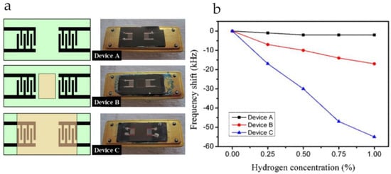 (a) SAW devices A (uncoated), B (conventional Pt/ZnO layer) having a chemical recognition layer between two sets of IDTs and device C (layered Pt/ZnO) which has a sensor layer extended on IDTs; (b) Sensor response of three devices A, B and C measured at room temperature and relative humidity of 30% for H2 gas (0–1%). Adapted with permission from [76], copyright (2012) Elsevier.