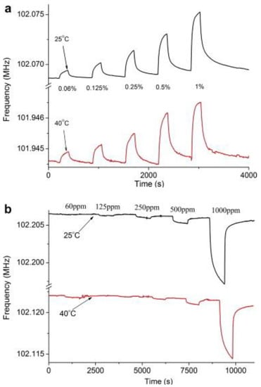 Graphene-based gas sensors [100,101,102,103] are extensively studied by various research groups. The principle detection mechanism is based on conductivity shifts due to adsorbed gas molecules which change the electron density. SAW sensors are mainly gravimetric (mass sensitive) transducers however, the change in surface conductivity of these devices leads to altered wave propagation velocity. Thus, they can be used as acousto-electric transducers [104], depending upon their interfacial coatings. Arsat et al. [105] used reduced graphene oxide nanosheets for H2 and CO detection at two different temperatures i.e., 25 °C and 40 °C. Both these gases are reducing agents however, upon exposure to the SAW sensor, H2 resulted in an increase in the resonance frequency whereas CO showed a decrease in frequency. Figure 7a shows the increase in frequency on H2 exposure while Figure 7b represents the drop in frequency for CO. The authors explained that H2 is 14 times lighter in molecular weight than CO and this leads to conductivity changes in graphene sheets whereas for CO mass loading is the dominant factor that leads to a drop in frequency. The adsorption of H2 on graphene sheets leads to a drop in conductivity that would increase the velocity of acoustic waves and thus, an increase in frequency was observed.