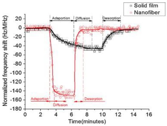 Liu et al. developed polyethylene oxide nanofibers film as SAW interfacial coatings for sensing of hydrogen peroxide vapors [132]. The authors used an electrospinning process to produce polyethylene oxide fibers having 100–300 nm diameter and 8.1 μm thickness. From Figure 8, it can be seen that polyethylene oxide nanofibers offer faster kinetics of adsorption, diffusion and desorption as compared to solid film. Moreover, the sensor response of nanofibers is much higher than that of solid films. Figure 8 excellently explains the advantage of using nanofibers film over solid film for sensitive and rapid vapor phase sensing.