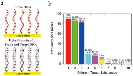 (a) Schematic representation of probe and target DNA hybridization at gold surface. (b) Comparison of frequency shifts for different samples. Adapted with permission from [148], copyright (2015) Elsevier. In this graph, 1: Target DNA (1 μg/mL) having 15 bases; 2: Non-target DNA (1 μg/mL) having 15 bases with one mismatch base sequence; 3: Non-target DNA (1 μg/mL) having 15 bases with two mismatch base sequence; 4: Non-target DNA (1 μg/mL) having only 4 bases; 5: Non-target DNA (1 μg/mL) having only 3 bases; 6: Target DNA (0.1 μg/mL) having 15 bases; 7: Target DNA (0.01 μg/mL) having 15 bases; 8: Target DNA (0.001 μg/mL) having 15 bases; 9: BSA sample; 10: PBS buffer.