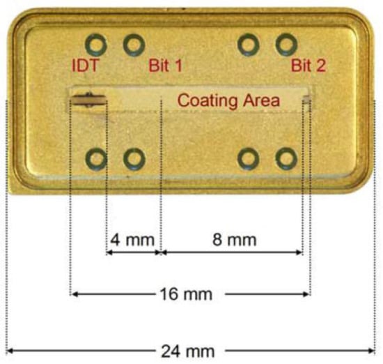 A typical RFID-tag coated with polyvinyl alcohol for humidity sensing. The figure shows the design details of the device, including the dimensions of the IDT, coating area and distances between IDT, Bit 1 and Bit 2 (reflections). Reproduced from [160], copyright Molecular Diversity Preservation International (MDPI).