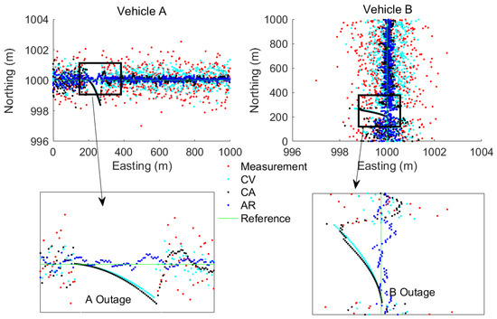 The horizontal positioning accuracy for both vehicles from the proposed PF-AR based fusion and the traditional CV and CA based algorithms, are compared with the reference trajectory to determine if the accuracy requirement of 0.5–1 m (95%) can be fulfilled. A summary of the position fixes from PF-AR, PF-CV and PF-CA are shown in Table 4. It is shown that the PF-AR estimated results improve the accuracy of the positioning significantly compared to the CV and CA scenarios in these three test cases. The 95% percentile accuracy in the head-on collision test case is 0.31 m (95%) for the PF-AR algorithm and 1.18 m (95%) and 1.09 (95%) for the CV and CA based scenario. In the intersection perpendicular collision case, the positioning accuracy is 0.30 m (95%) for the PF-AR algorithm, 1.21 m (95%) in the CV scenario and 1.04 m (95%) for CA. In the rear-end collision test case, the positioning accuracy is 0.28 m (95%) for the PF-AR algorithm, 1.13 m (95%) for CV and 0.92 m (95%) for CA. Overall, the PF-AR algorithm has significantly improved the positioning accuracy compared to the other traditional motion model based scenarios.