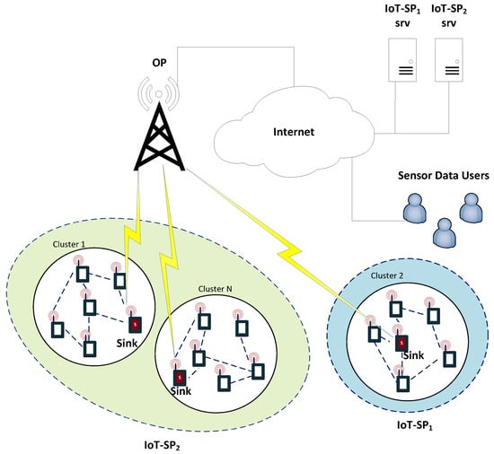 We consider the IoT scenario that is depicted in Figure 1 with two IoT-SPs deploying their private WSNs in order to provide sensor-data-based services to sensor-data users or simply final users, who pay to the IoT-SPs for this service. The sensor nodes are grouped into clusters. Each cluster has a large number of sensing nodes connected through a multi-hop wireless network [], and belong to only one IoT-SP. Each cluster has a sink node, which transmits the data collected by all the nodes in the cluster to their IoT-SP server (IoT-SP srv) through a network operator (OP) and Internet. In the IoT-SP servers the data is aggregated in order to provide a service to final users. Our scenario has the following market actors: