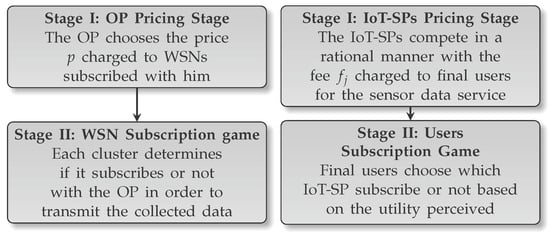 Optimal profits could be obtained if the IoT-SPs were able to change their sinks’ decisions, however, in most real scenarios it is not possible due to energy limitations. Change sinks’ decisions implies a constant communication between the IoT-SPs and sinks, which requires a lot of energy, which typically is a limited resource in WSNs [,], although there are cases where the sensors could be wireless-powered []. In this paper, we consider the case where the energy is a limited resource, in order to be the as general as possible. Assuming that the IoT-SPs cannot influence in the decisions of their sinks, the model can be analyzed as two games of two stages. The model has the characteristic that both games are connected through the value of  in (6). Both games have a similar structure: firstly a pricing stage and secondly a subscription stage. The game model is summarized in Figure 3.
