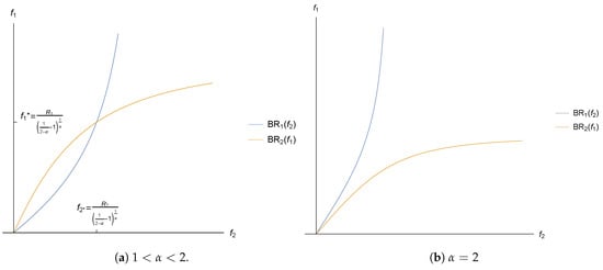 Given that  and  are positive, Ai has to be positive. From Equation (33) we can infer that , otherwise Ai would be negative, and there would be no real solutions for . In addition, we see that there is only one pricing equilibrium different than  if and only if . Figure 5a shows a particular solution when , where we observe that there is a Nash equilibrium where the best response functions intersect. On the other hand, Figure 5b shows how the best response functions of both operators only intersect in , and therefore the only possible solution when  is .