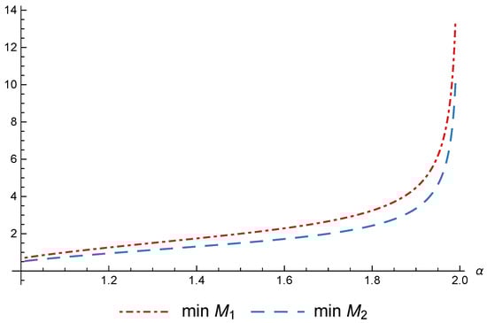 Restrictions (38) and (39)are represented in Figure 7 as  and  respectively. When the value of  is near to 1, the impact of the ratio  in users’ utility is low, and the providers can increase their prices, obtaining, as shown, positive profits with a very small pool of users. However, when the value of  increases the providers have to decrease its prices in order to attract users and the revenue per user decreases drastically, while the cost of sensor data collection remains constant. In order to obtain positive profits an increasing number of users M is needed as  increases, with an asymptotic behavior in .