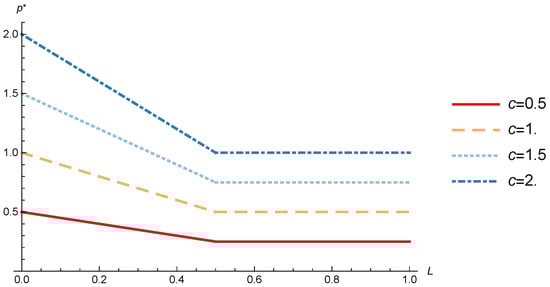In order to study the Game I results we show the optimal price  and the OP profit , varying the maximum system load L and the parameter c.