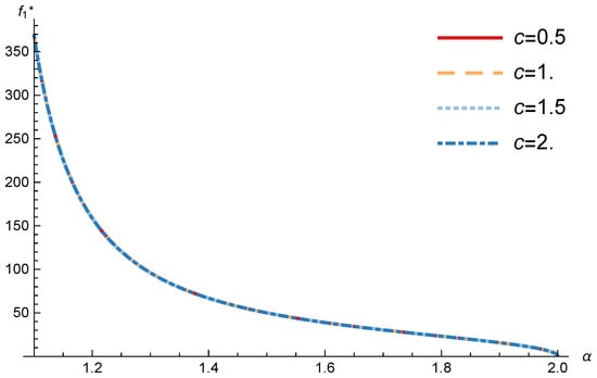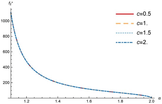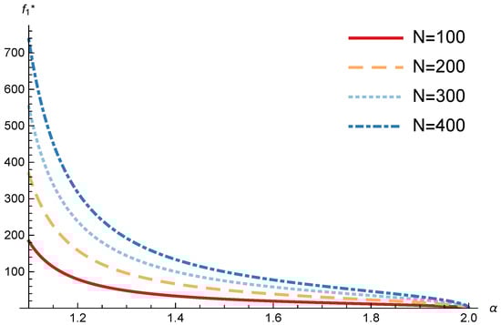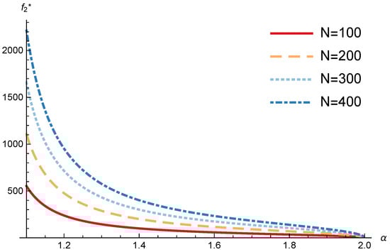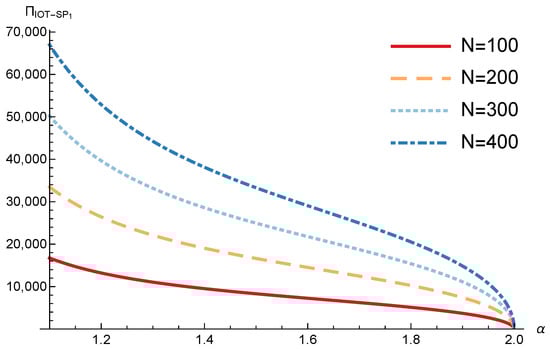 Figure 11 and Figure 12 show the IoT-SP equilibrium price  as a function of  for different values of c and N respectively. The equilibrium price does not depend on the value of c and increases with N, due to the higher utility perceived by users. Note that it only happens if the maximum system load . We also observe that when users’ sensitivity to  increases, the IoT-SP optimal price decreases very fast.