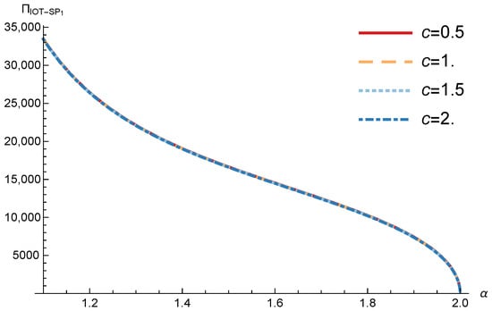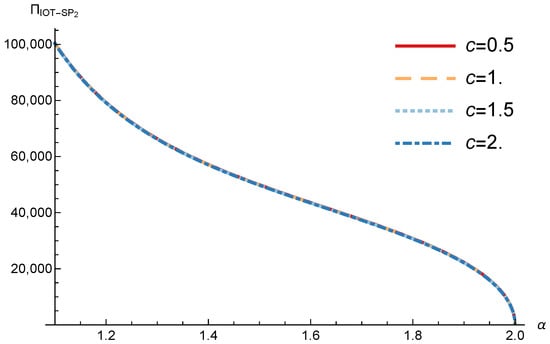 IoT-SP equilibrium profit as a function of  for different values of c.