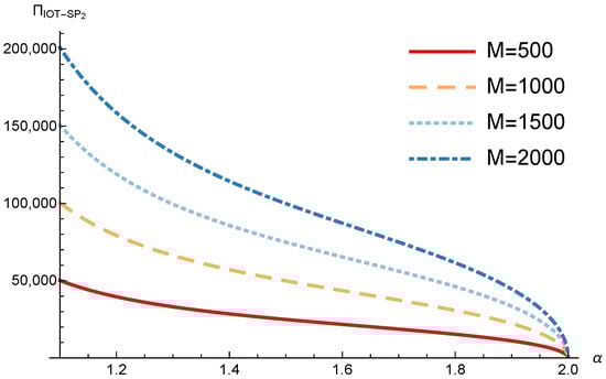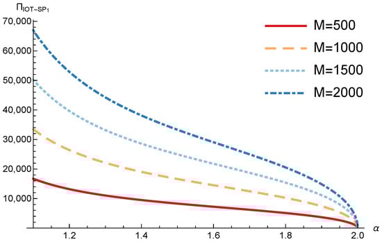 IoT-SP equilibrium profit as a function of  for different values of M.