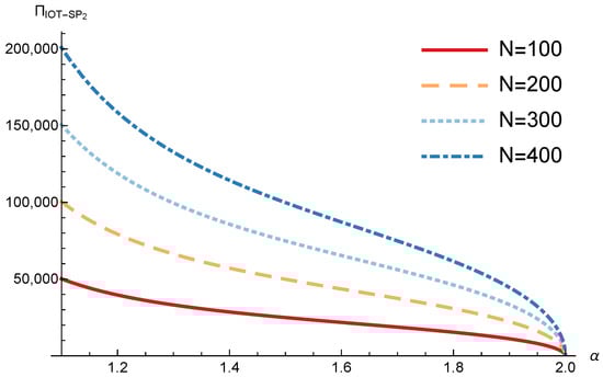From previous results we observe that users’ sensitivity parameter  is critical in the second game. For values of  and  it is not possible to reach an equilibrium with positive profits, as deduced from the analysis. In addition, if the value is in the range  it still has a huge relevance in the IoT-SPs equilibrium decisions and profits, not only in the value of them, but also in the feasibility of the whole model as deduced in (38) and (39).