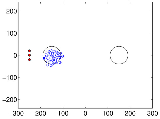 The control term, , in Equation (10) is an essential term for herding a flock to the desired destination, while the other terms are related to maintaining the flock or avoiding obstacles. We can say that a shepherding robot has a pushing force of moving the flock, since the sheep agents try to avoid the shepherding robot. If a steering robot is far away from the flock or the flock is away from the desired target location, the control term moves the steering robot to the opposite direction of the target. It gradually reduces the distance gap between the flock and the target position. If the flock is maintained well, the flock can be guided to the desired goal due to this control input. The interaction between the flocking behavior among the homogeneous group and the shepherd-avoiding behavior of the flock may influence the stability of the performance. However, if prior conditions for flocking of sheep agents are satisfied, their movement to the target can be completed without difficulty. The coordination of steering robots to move the sheep agents can be another factor that affects the performance. An inhibition among steering agents allows them to keep space among them and efficiently control the sheep agents. The appropriate choice of parameters can achieve the stability of convergence to reach the target position. In our experimental setup with control parameters, the flock moved to the destination without failure over many trials.