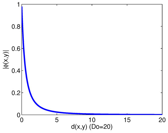 where is the Euclidean distance between and q, q is the averaged vector of the neighboring agents within the detecting range and is the cutoff distance with which the collision-avoidance can be triggered in the potential field. The above term corresponds to a gradient of the potential function defined in [5], which is inversely proportional to the distance. The normalized vector sum in the product represents the unit vector to define the moving direction. The function guides the direction away from neighbor agents, as well as calculates the potential level from a neighbor agent as shown in Figure 2.