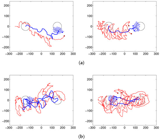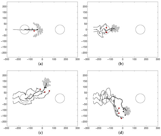 Figure 10 shows various cases for which the flock of sheep agents is not controlled well to achieve the desired goal by changing the parameters related to the shepherding task, namely for the sheep agents and , and for the steering agents. Figure 10a shows the result when is not large enough, for example when . This parameter controls the collision avoidance of steering agents from the flock. If the steering agent moves too close to the center of the flock, it changes the shape of the flock. Therefore, we used a high value of 5000 for the parameter to prevent the flocking pattern from being scattered. If the flocking tendency among the sheep agents is not strong, the flock collapses easily into a scattered pattern. Figure 10b shows the result when is changed from the normal setting of 800 to 10. This parameter controls the interaction among the steering agents. It can be seen that collision avoidance and arc formation among the steering agents were not induced. Figure 10c,d shows the results when and are changed to 0.002 and 10, respectively from the normal setting of and . It can be seen that by setting the parameters and with these small values, the steering agents drove the flock to the goal, and the sheep robots moved away from the approaching steering agents, respectively. However, since both terms are too small, either the steering agents moved in the wrong direction or the flock was not controlled well.
