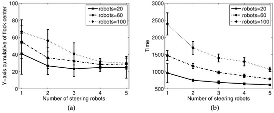 Comparison of varying numbers of steering and sheep robots: (a) cumulative score of the y-position deviation of the center of the sheep flock from the y-axis and (b) time needed to reach the goal area.