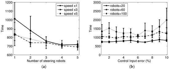 To analyze the effect of the moving speed of robots, we change the moving speed of the steering agents while the speed of the sheep agents keeps constant with the previous simulation. Figure 8a shows the results when the moving speed of steering robot is three- and five-times faster than the sheep robots. There were 30 sheep robots in this experiment, and it shows that the time needed to reach the goal decreases as the number of steering agents increases. This result is consistent with the previous results. However, we note that the effect of the moving speed of the shepherding robot can be observed under limited conditions for which there are only one or two steering agents, and the speed is the same as the sheep agent. With multiple steering robots, the performance is less affected by the herding speed. Figure 8b shows the result when there are three steering agents and different levels of noise errors are added to the control input, . The performance becomes worse slightly proportional to the input control error with a large flock of sheep agents. However, it seems that the overall performance is well maintained, and the current shepherding system is robustly working for a reasonable size of sheep agents.