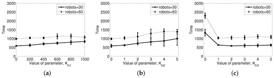 We investigate how the system responds to the set of scaling parameters mentioned above. The shepherding task was tested with three steering agents for 30 and 60 sheep agents. In the control algorithm, there are several variables: scaling parameters, the range of perception, the size of the flock and the parameters of the noise distributions. The scaling parameters are mainly classified into two categories, namely parameters to form a flock of sheep agents and parameters to perform the shepherding action for the steering agents. Figure 9 shows the effect of parameters on the formation of a flock in the shepherding task; is related to the distance kept from other agents, is used to remain close to the flock, and is related to the velocity matching among sheep agents. From the results, we note that and have a negative effect on the herding performance, whereas has a positive effect on the herding performance. Due to the cut-off distance in the gradient of the potential function, and have a limited effect. Nevertheless, the shepherding task is not possible if is set to zero. This term is related to the velocity matching among the sheep agents, and in order to improve the herding performance, the movement speed of the steering agents is often transferred to the sheep agents. The shepherding task is based on the assumption that the flock is maintained well. We can set each parameter to form a flock, as well as to respond to the steering agents properly.