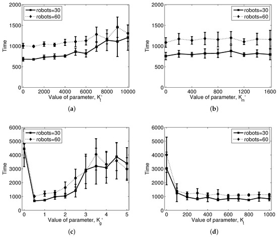 A more detailed analysis of the parameters to achieve the shepherding task is shown in Figure 11. It shows the ranges of parameters that are valid for the shepherding task. We evaluated the amount of time required to complete the task, that is the time required for a flock of sheep agents to arrive at the destination area. If the flock does not reach the goal, the result is set to the maximum simulation time, which is 5000 time units. Figure 11a shows the result of the interaction between the steering agents and sheep agents by changing the parameter . As the value of the parameter increases, time needed to complete the task increases. With high , a set of steering agents moves slowly towards the sheep agents, which delays the shepherding task. In contrast, small has the potential to move directly towards the center of the flock, and this could scatter the flock into subgroups if there is weak cohesion among the sheep agents to form a flock. In Figure 11a, the flock is not scattered with small , due to the strong cohesion among the sheep agents to form a flock and the collecting behavior of their steering agents. In this way, many parameters are intertwined together for the shepherding task. Figure 11b shows the result of the interaction among the steering agents when is changed. It seems that this parameter does not have any effect on decreasing the time required to reach the goal. However, it is definitely required for collision avoidance among the steering agents. In addition, if the flocking cohesion is weak, the arc formation among the steering agents will help with improving the performance by preventing the escape from the flock. Figure 11c shows the result of the change in . This parameter is related to the map information, and the flock cannot reach the goal without this term. The performance decreases as the value increases to a high level, since too much concentration on the goal disturbs the movement of steering agents on the right track, ultimately influencing the movement path of the flock. Figure 11d shows the result of the change in . The performance converges as the value increases. From the results, it can be seen that the overall performance is changed depending on several factors. An optimized setting of parameters can be searched to improve the performance; however, it is left as our future work.