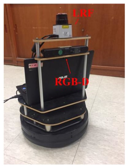 This section describes the implementation of the RGB-D SLAM and LRF SLAM that are usually used for mobile robots in indoor environments, and compares the results of each SLAM method. Figure 1 presents turtlebot.2 from the Yujin Robot, which was used as the mobile robot in the experiment. The height of the robot is 50 cm. A 2D LRF and a RGB-D sensor were installed on the robot. The LRF and the RGB-D sensor were installed at a height of 57 cm and 45 cm respectively. The LRF sensor (URG-04LX from HOKUYO) has the measurable angle of 240 degrees, the distance resolution of 1 mm, and the angular resolution of 0.3515 degrees. The RGB-D sensor has the measurable angle of 57 degrees, the distance resolution of 2.5 to 4.8 mm, and the angular resolution of 0.097 degrees.