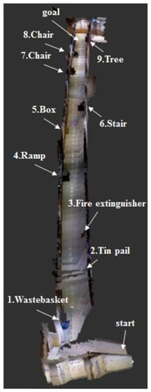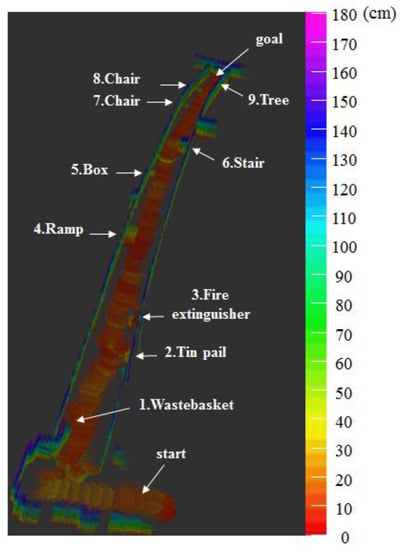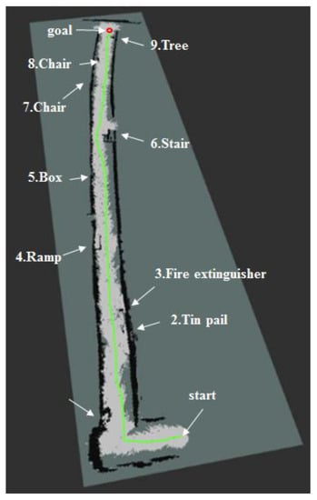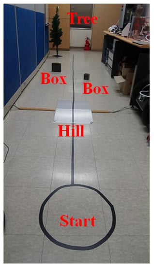 Figure 2 shows the designed experimental environment. The robot navigated back and forth on a 10-m section of the straight black line. The location errors were calculated from the difference between its actual location and the location estimated by SLAM after navigation. As shown in the figure, obstacles such as a sloping hill, a tree, and two boxes were installed in the experimental environment. Experiment shown in Figure 2 was carried out in the indoor environment, of which dimensions was: 15 m (length) × 1.5 m (width) × 2.5 m (height).