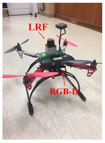 Through the two experiments, this study verified that topography and presence of obstacles cause location recognition errors in the LRF and RGB-D SLAM using a mobile robot. Thus, when using a mobile robot for mapping, a navigation algorithm that allows avoidance of obstacles is absolutely needed. To address these issues, this study performed SLAM using an aerial robot that is virtually unaffected by geographic features, and an RGB-D camera that includes information on various obstacles. Figure 5 shows the DJI F450 series aerial robot used in this study.