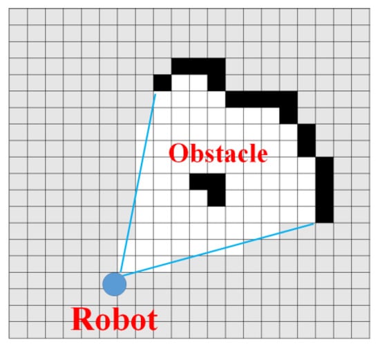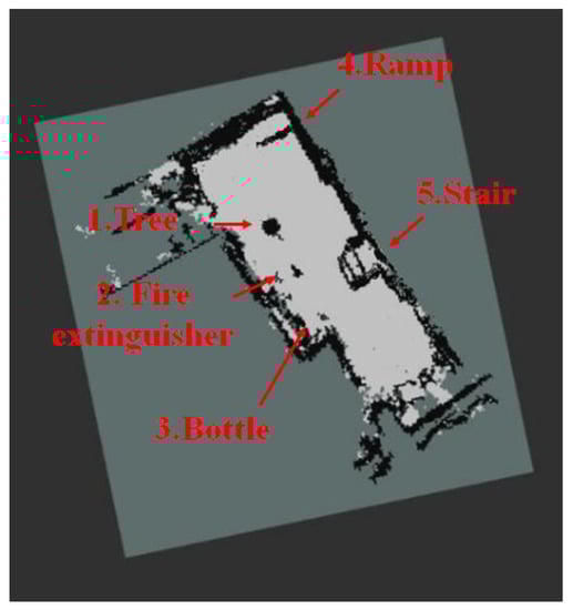 This study used an occupancy grid map to generate the 2D map []. An occupancy grid map is a grid block map, which is the most typical map concept used for generating 2D maps. Each block expresses geographic features and obstacles surrounding the robot detected by the robot’s sensor in white and black. Figure 7 is an image that simply expresses an occupancy grid map.