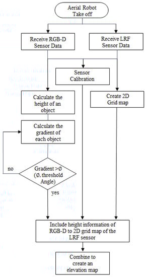 An aerial robot was taken off to generate an elevation map. Data of the RGB-D sensor and the 2D LRF sensor are gathered to calculate the robot’s current location and correct location recognition errors. After that, scan matching with LRF scan information was used to correct errors in location estimation. With obstacle height calculated with RGB-D depth information, the slope of the obstacle was also calculated. When the slope of the obstacle exceeds the threshold of a critical angle, it is recognized as an obstacle, while ignored when it does not. In addition, another process was needed to project the height information obtained with an RGB-D sensor in the LRF generated grid map. It is difficult to generate 2D map information when using only a 3D RGB-D sensor, while the 3D RGB-D sensor used in this study was not suitable in scan matching because of its small angle of view. To overcome this shortcoming, a 2D grid map was generated through the LRF sensor, and the height information obtained by the RGB-D sensor was mapped onto the 2D map.