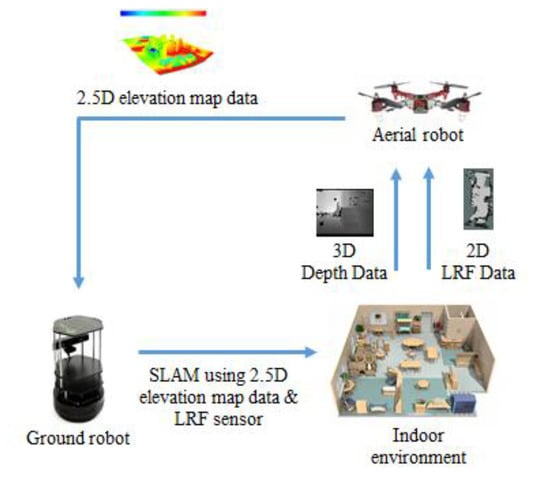 Recently, SLAM studies are being carried out through cooperation of a UGV (unmanned ground vehicles) and UAV (unmanned aerial vehicles) to actualize more accurate mapping by improving capability in situational awareness and environment interaction [,,].