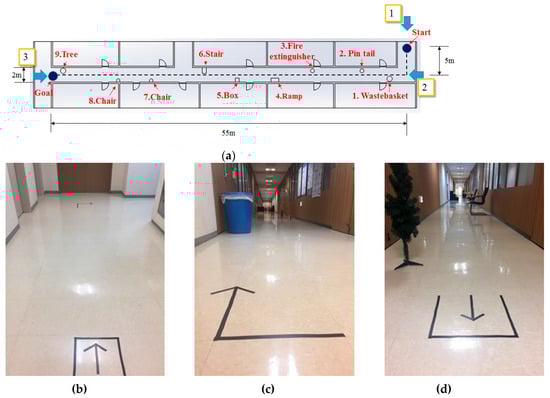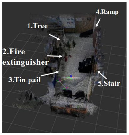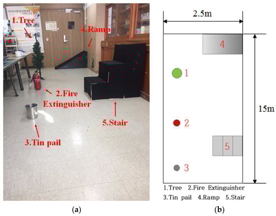 To compare the accuracy of map generation and location recognition of the RGB-D SLAM, LRF SLAM, and the algorithm proposed in this paper, the robot navigated back and forth within a fixed distance (10 m) under the experimental environment shown in Figure 10a. After the navigation, error between the robot’s actual location and the estimated location was calculated. Moreover, as shown in Figure 10b, obstacles included a tree, fire extinguisher, tin pail, ramp, and stairs.