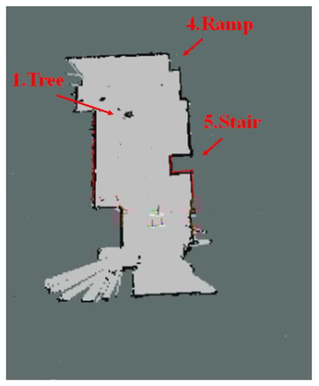 In case of RGB-D SLAM, the robot was able to recognize obstacles of lower height. Further, as the RGB-D SLAM does not rely solely on the wheel’s encoder information, it was able to reduce errors during the slope navigation by using visual odometry information to correct error. Despite the corrections, however, an error of approximately 5–10 cm occurred due to vibrations of the robot and camera movement during the slope navigation. Moreover, due to the 3D mapping, there was significant data computation increase, and the processing speed was about 3–4 fps (frames per second).