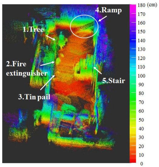 When the map was generating by using the 2D LRF as shown in Figure 18, there were obstacles that were detected and the ones that were not, depending on the flying altitude of the aerial robot. The aerial robot that worked at a height of 1 m detected tall obstacles (tree, upper stairs, upper part of the slope, garbage can), but not the lower ones. For the 2D LRF SLAM, location recognition error was about 2~3 cm and computing speed was about 25~30 FPS, which is quite fast.
