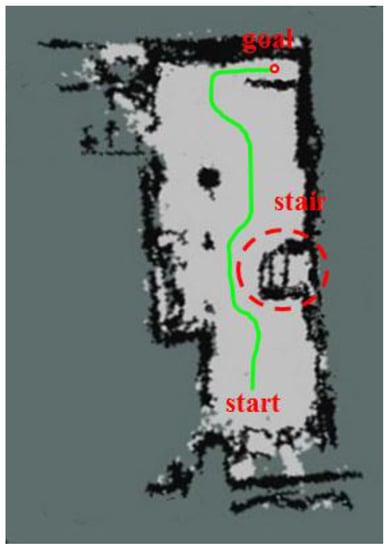 Figure 21 shows the traveling trajectory of the mobile robot using the 2.5D elevation map. The red dot and green line respectively refer to the destination and the actual navigation route traveled by the mobile robot. The robot was able to reach its destination without colliding with obstacles.
