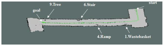 Next, a navigation experiment was conducted to check whether tasks of avoiding the obstacles and travelling up the slope were possible when the mobile robot is using the proposed SLAM algorithm. The black line of Figure 15 shows the traveling trajectory of the mobile robot using the 2.5D elevation map. Figure 16 separately shows the grid map of the 2.5D elevation map so that the navigation results presented above can be more clearly. The red dot and green line respectively refer to the destination and actual navigation route traveled by the mobile robot.