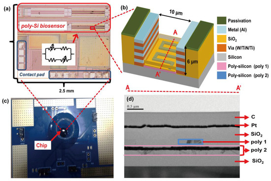 (a) A chip photo of the fabricated CMOS poly-silicon biosensor in the arrangement of Whetstone bridge architecture; (b) a schematic of the cross section of designed CMOS poly-silicon biosensor; (c) a bio-measurement module with CMOS poly-silicon biosensor chip wire-bonded within a plastic reservoir; (d) a TEM picture of the cross section of fabricated CMOS poly-silicon biosensor.
