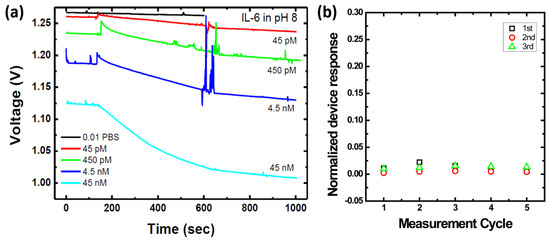 In the first step, the sensing characteristics of the developed poly-silicon biosensors were examined by different biomarkers in buffer solutions. Although all three biomarkers, IL-6, cTnI, and NT-proBNP, have been examined, the experimental temporal response of IL-6 results are shown in Figure 2a to elucidate the examination process of the developed devices. It is clear that the sensor output voltage decreased as IL-6 concentration increased. It should be noted that the pH value of the measurement buffer used in the IL-6 experiments was 8.0. This is because the isoelectric point (pI) value affects the biomolecules’ net charge, which is the main factor in the field-effect sensing mechanism. The pI values of the three target biomarkers are different from each other. Based on previous reports, the pI values of IL-6, cTnI, and NT-proBNP are roughly 6.7, 5.2–5.4, and 6.3, respectively [22,23]. As a consequence, the pH value of the measurement buffer was 8.0, according to IL-6 measurements. At the same time, the pH value of the measurement buffer remained 7.4, according to both cTnI and NT-proBNP measurements.